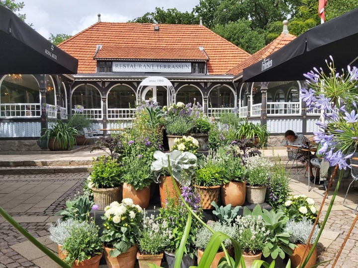 Når man skal bygge sådan en krukkehave op, må man se lidt på, hvor den skal være, så den spiller sammen med omgivelserne. Claus Dalbys udgangspunkt for farvevalget var det gamle skilt ved Restaurant Terrassen.
