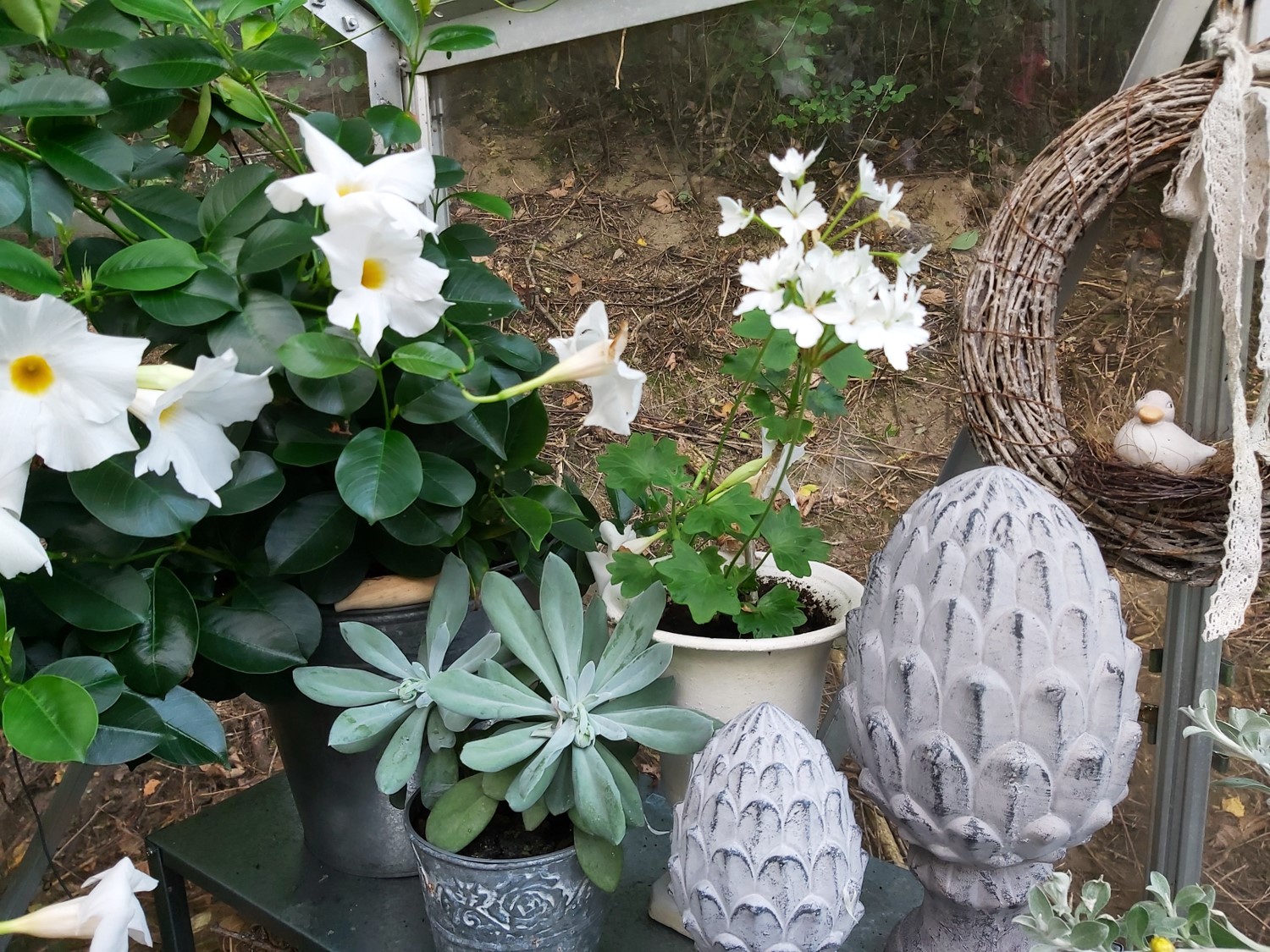 Man kanter sig rundt ad hyggelige smalle stier mellem bede og krukker. Frodigheden er overvældende, og man møder både masser af blomster og sødt sovende katte i bedene. Der er pelargonier udenfor, og der er pelargonier i to store drivhuse. Mange, mange slags, og de står tæt.