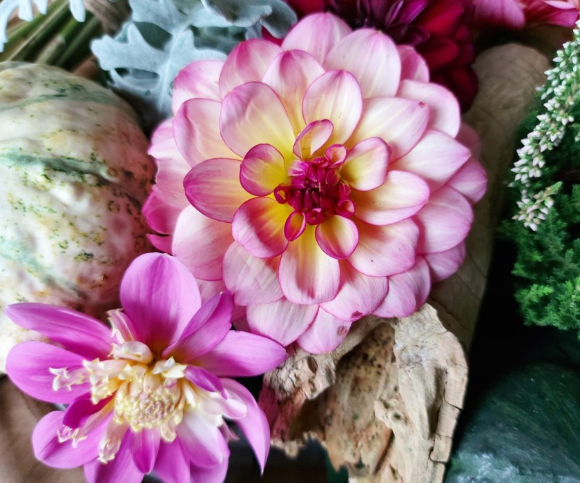 Georginerne, der heldigvis ikke blev ramt af frosten for et par uger siden, står så fint endnu. Det var oplagt, at der skulle georginer i skålens første dekoration, ikke? Georginerne mildner overgangen mellem sommer og efterår.