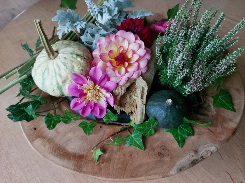 Den slags synes jeg nu, det er alt for tidligt at tænke på. Til gengæld er det tid til efterårsdekorationer. Jeg har ikke rigtig villet acceptere, at det var blevet tid til græskar og lyng – ligesom jeg har kviet mig ved at skifte fra sandaler til sokker og sko – men nu er det oktober, og nu er det altså tid, hvis man skal nå det, mens der stadig er blomster i haven.