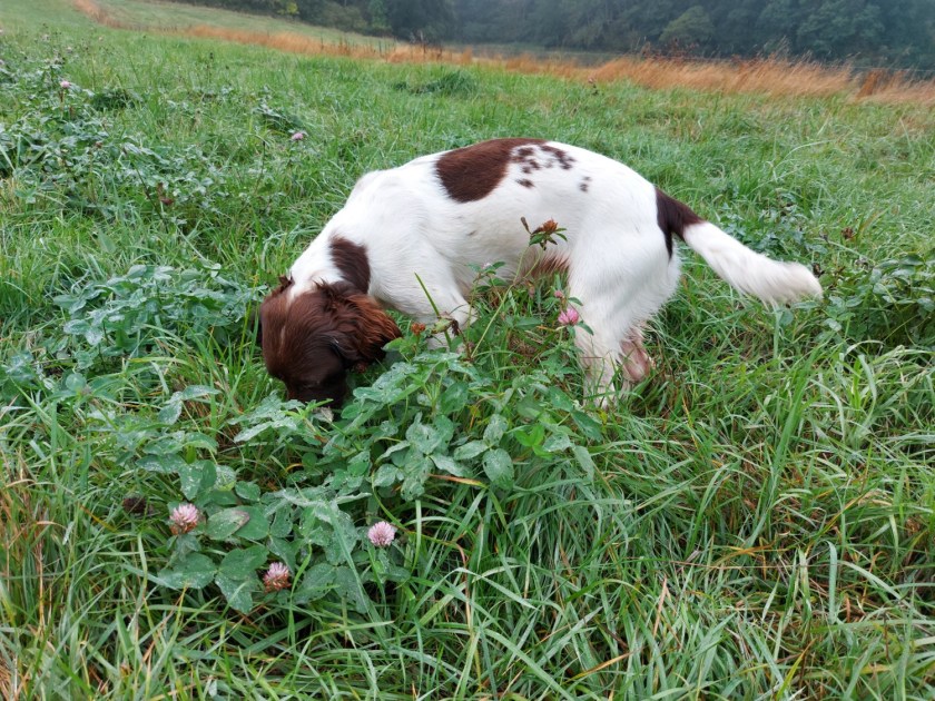 Begge hunde undersøger hver en græstue, når vi går markture. Man ved jo aldrig, hvor der kunne gemme sig en fasan, vel?