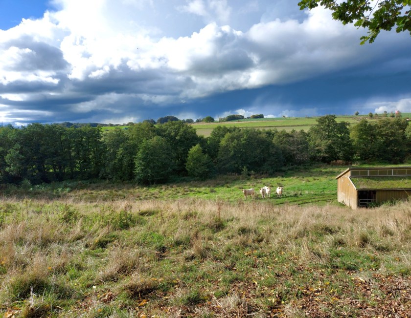 Men oktoberlyset har en helt anden farve, fordi der er blade på træerne, og fordi de blade er begyndt at skifte farve. Luften flimrer af farver, for farver består jo af lys. Når solen lyser ind under tunge regnskyer som i går, kan man opleve de mest fantastiske syn. Græsset bliver nærmest selvlysende,