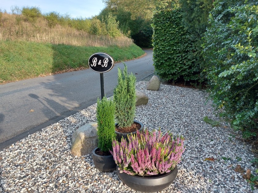 Så blev det min tur. Tre krukker ved B&B skiltet er mit lille bidrag til festen. Og med vanlig beskedenhed må jeg sige, at det da lige er prikken over i’et?