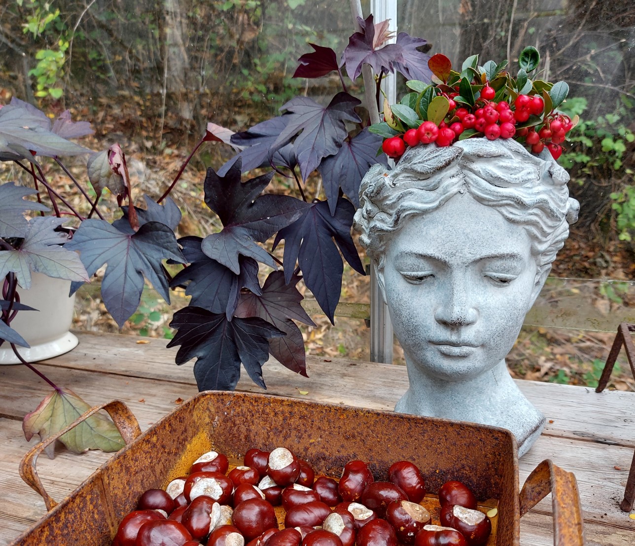 Kransen hænger nu på hovedøren. Kastanjer bliver så hurtigt matte indendørs. Lige nu skinner de på ægte kastanjevis, og det bliver de ved med længe, når bare de er udenfor.
