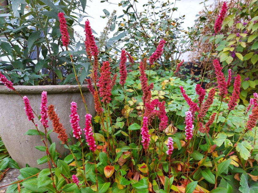 Det regner lidt, og det drysser ned med blade fra alle de store træer, der omgiver haven. Blade og ahornfrø, der snurrer gennem luften som små helikoptere. Men midt i efterårets forfald er der farveklatter, der lyser op mod de brune, våde blade.
