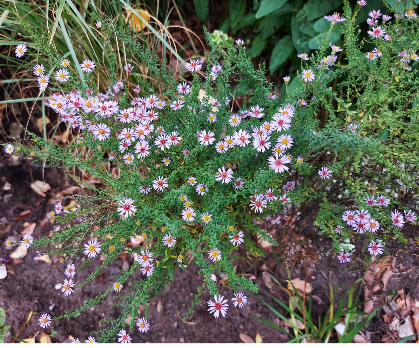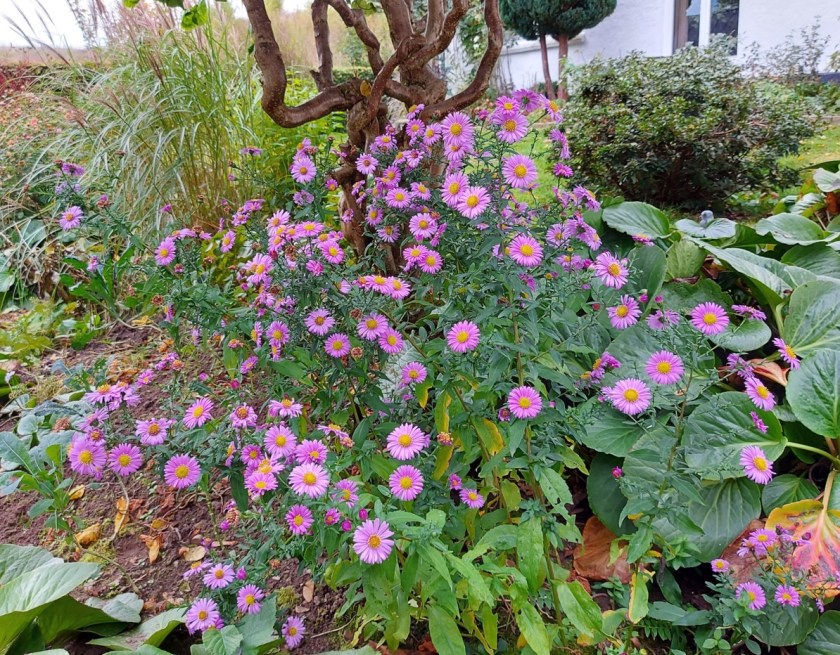 Og asters – den almindelige lyslilla asters vokser bedre nu, hvor troldhasselen er blevet opstammet, og den får mere lys. Man ænser den dårligt i løbet af sommeren, men hvor er den skøn at have lige nu.