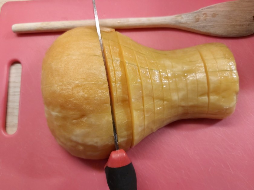 Nu er squashen til at skære i. ‘Hasselbach’ den så. Skiver, der ikke går helt igennem. For at undgå at skære helt igennem kan man lægge en grydeske på hver side af squashen, når man skærer i den. Jeg har kun én grydeske af træ, så jeg nøjedes med den. Det gik fint.
