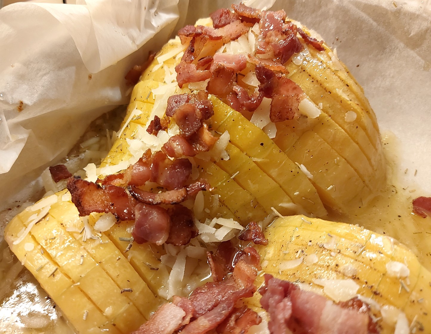 Skær din butternut igennem på den lange led og fjern kernerne. Skræl den så. Jeg brugte en almindelig kartoffelskræller, og det gik fint. Læg den på bagepapir i et ovnfast fad og smør den med halvdelen af det smeltede smør. Drys med salt og peber. Bag den i ovnen på 200 grader i 20 minutter. Riv parmesan og steg dit bacon imens.