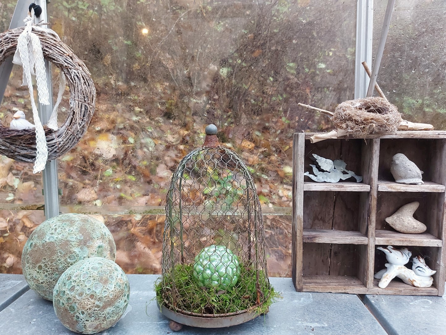 I dag i den silende regn var det oplagt at gå en tur ud i drivhuset for at se på, hvordan vinterpynten skal se ud i år. Der er så hyggeligt derude, når regnen drypper på taget, så jeg tog lidt forskud på glæderne og flyttede lidt om på det ene og det andet og puttede lidt grønt i potter og krukker.