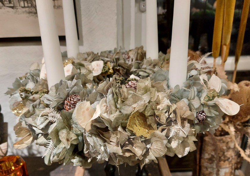 Kransen blev flot, og Margits univers i det store kursuslokale/butik er noget så inspirerende at være i. Ideerne står i kø, og sådan er det jo, når det er bedst.