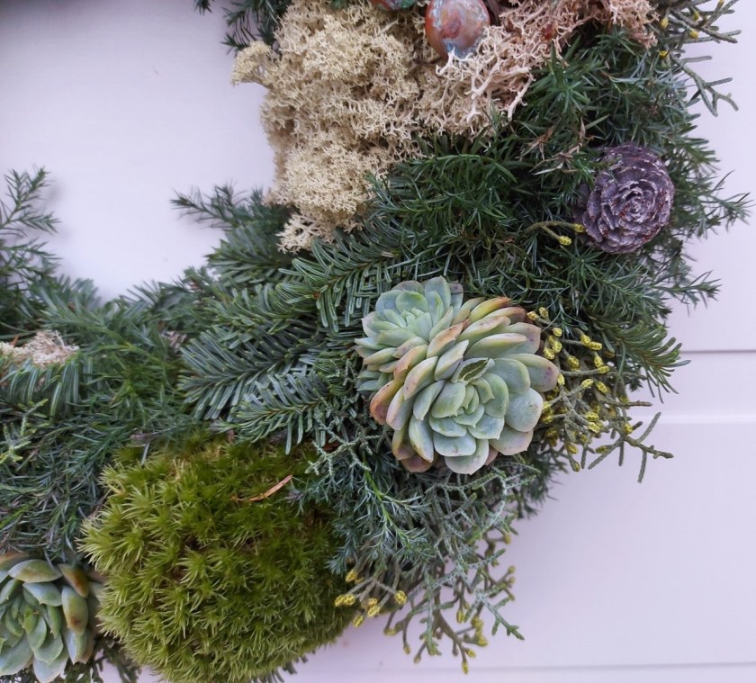 I kransen er der hvidt mos og pudemos, der er blød ene, gran og cypres, og til sidst er der pyntet med echeveria, kogler og de fineste, små kobberblomster.