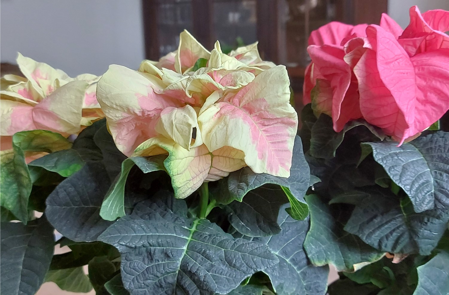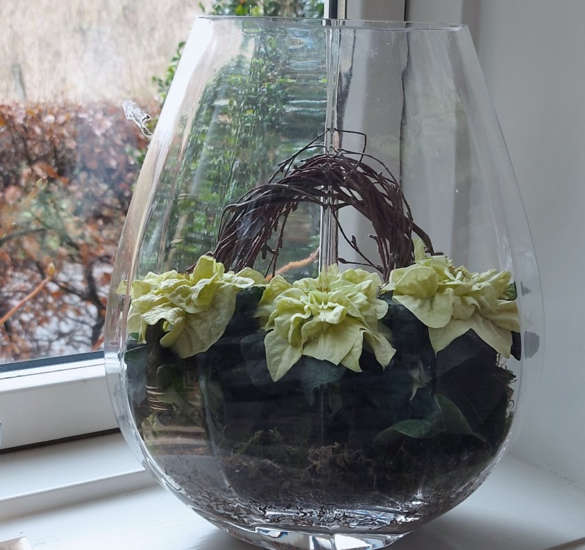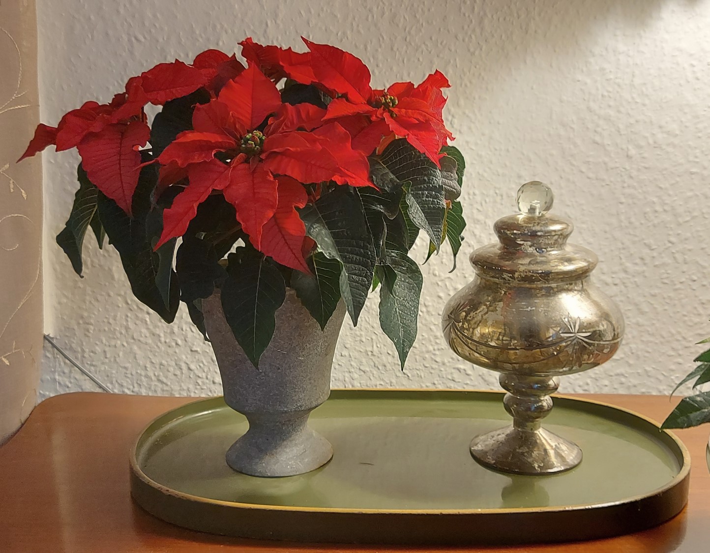 1. Det er sjældent, jeg støder på de lyse, men det nederste billede er virkelig fint – og godt eksempel på at bruge julestjerner på andre tidspunkter end december. De første mange år fik jeg altid overvandet dem, men de senere år har jeg nærmest haft det ‘omvendte’ problem, da de røde julestjerner lever til langt inde i januar, hvor min ægtefælle i hvert fald ikke vil se mere på dem 😀 😀