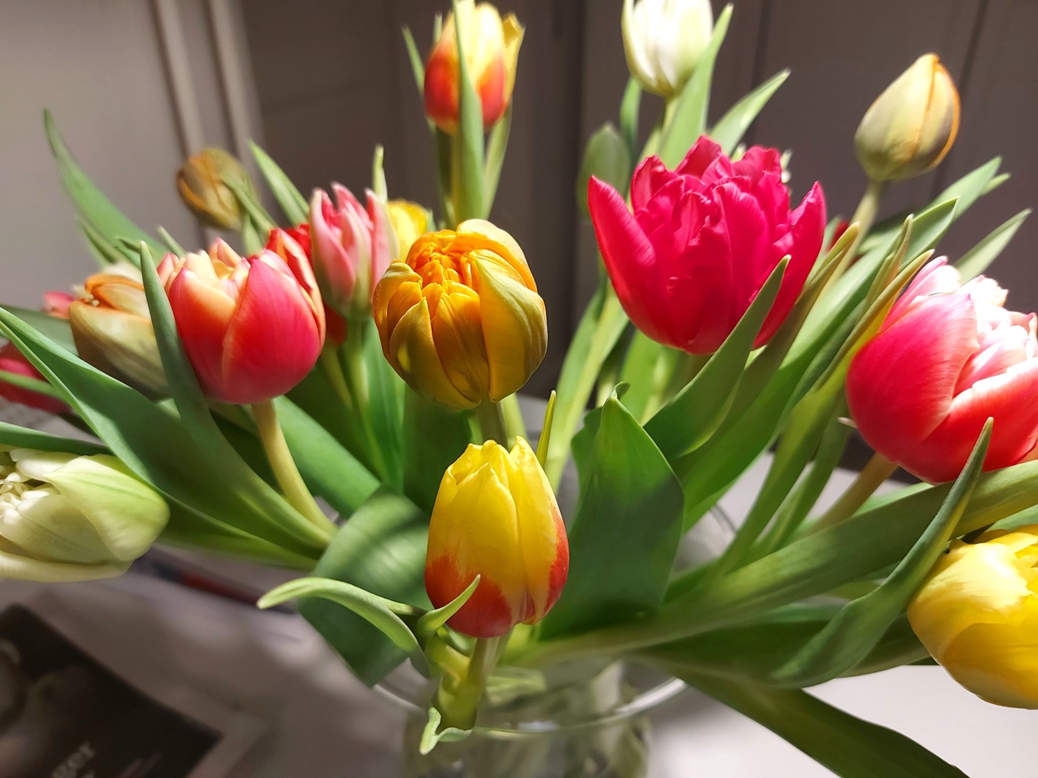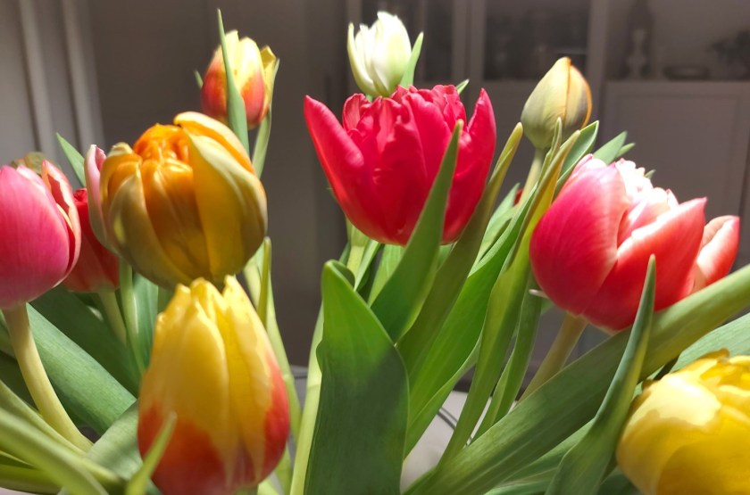 Vi har købt tulipaner. En broget buket, der sprudler af energi og livslyst.
