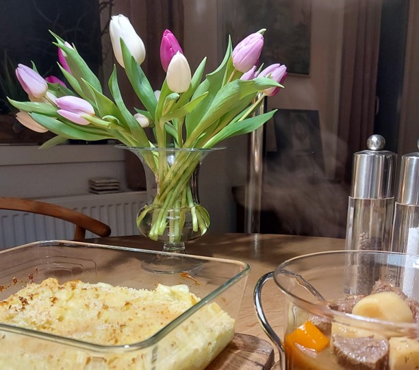Huskede jeg at sige, at du skal rydde op undervejs? Et ryddeligt køkken, en gryde, der står og simrer, ild i brændeovnen og blomster på bordet giver lige den helt rigtige følelse af afslappet weekend.