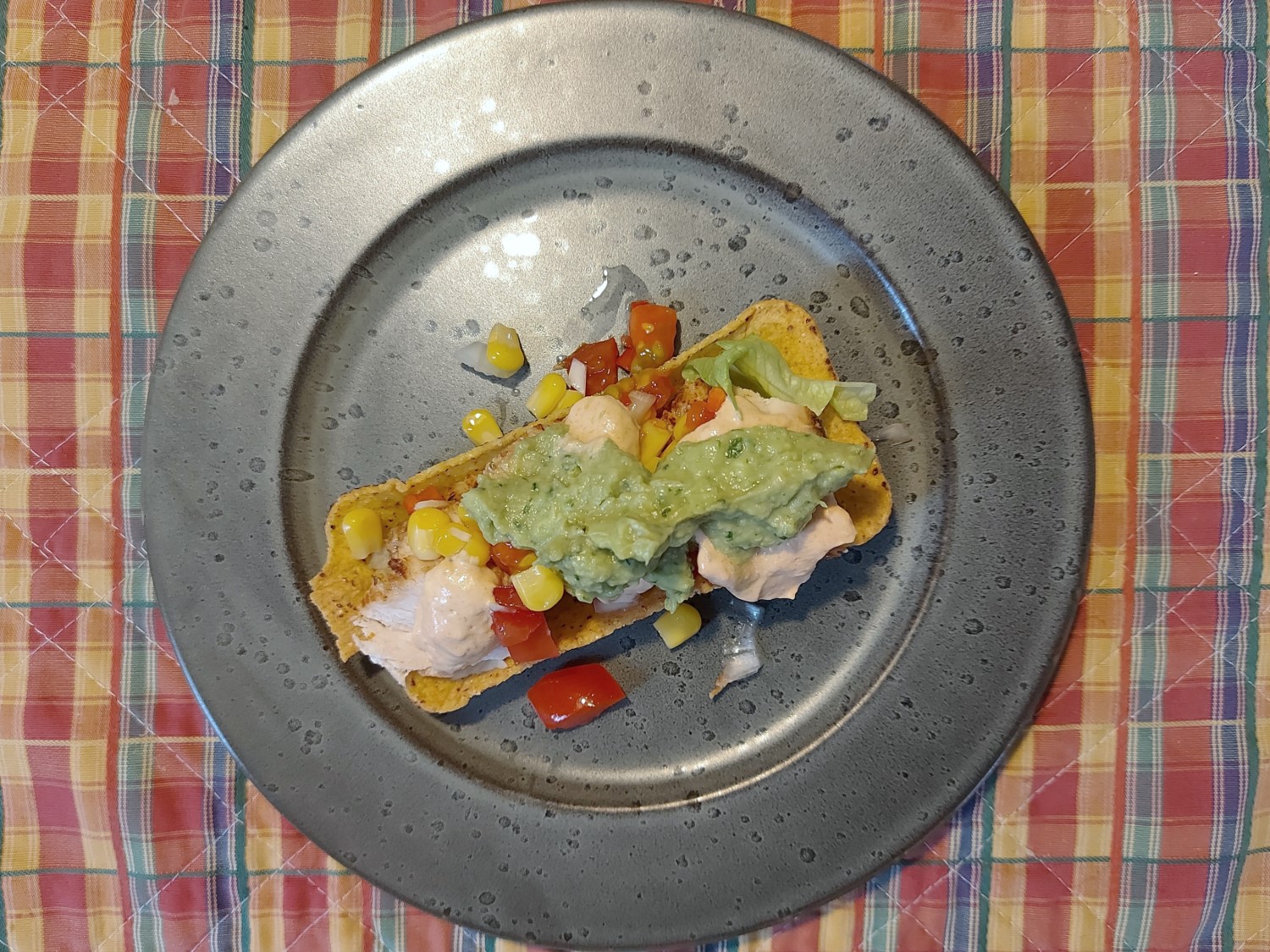 Sprøde taco tubs, sprød salat, marineret og stegt kyllingebryst, Colorado Kates friske majssalsa, en mild guacamole og en hot, hot chipotle dressing.