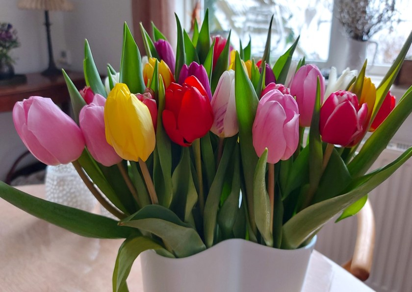 På spisebordet står en stor flok mangefarvede tulipaner. Et rigtigt festfyrværkeri.