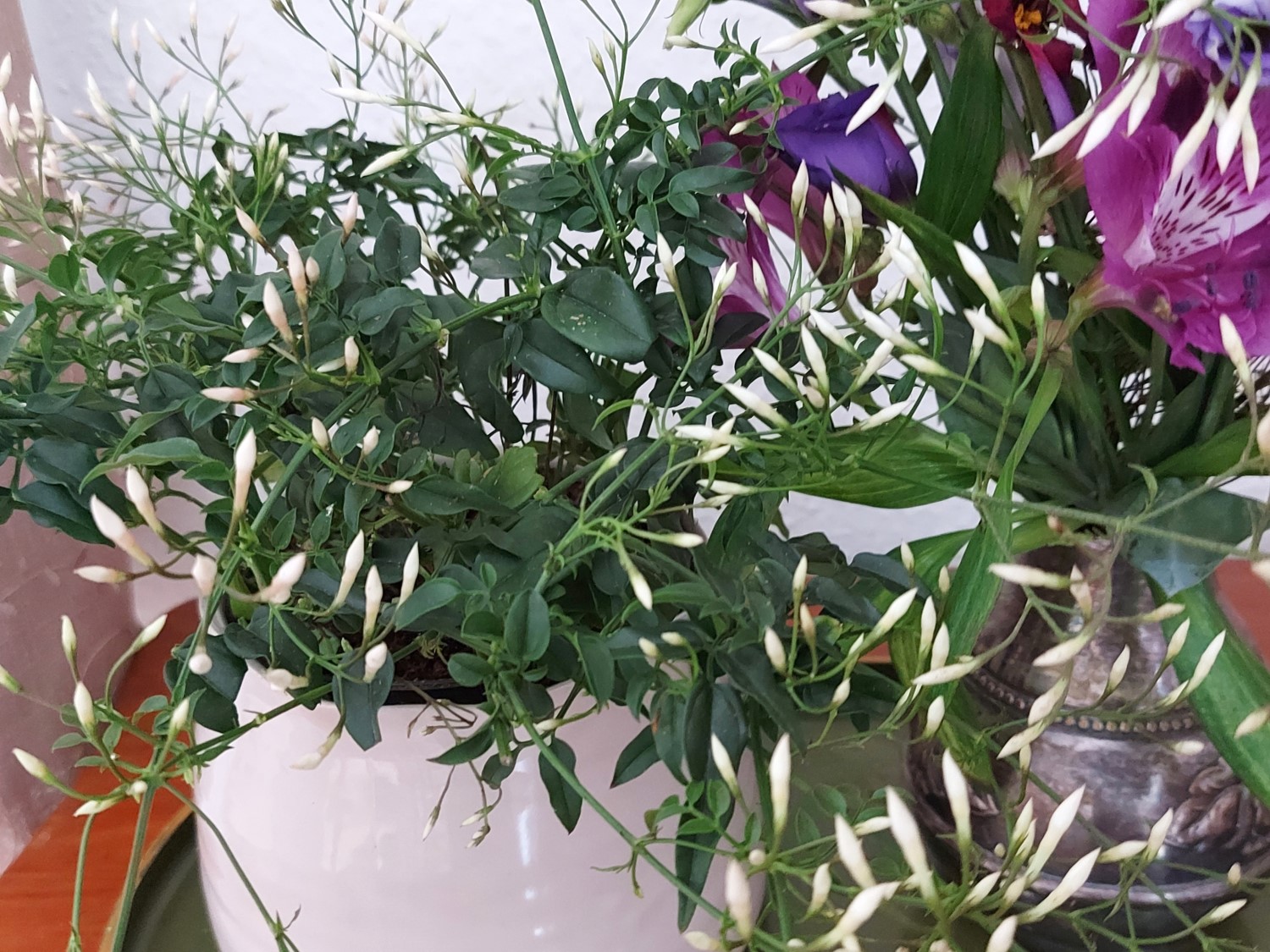 På det lille mormorbord i hjørnet står der en duftjasmin. De stod og så fine og lette ud i forretningen, og en af dem sprang op i indkøbsvognen helt af sig selv. Det er planter jo kendt for at gøre. Af og til. Altså en gang imellem… eller øh…. lidt tit… ?