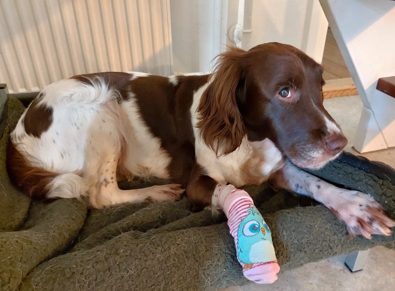 For nogle måneder siden kom Rosie til skade med sin trædepude. Der måtte dyrlægebesøg til samt en sok på foden og plasticpose over, når hun skulle ud.