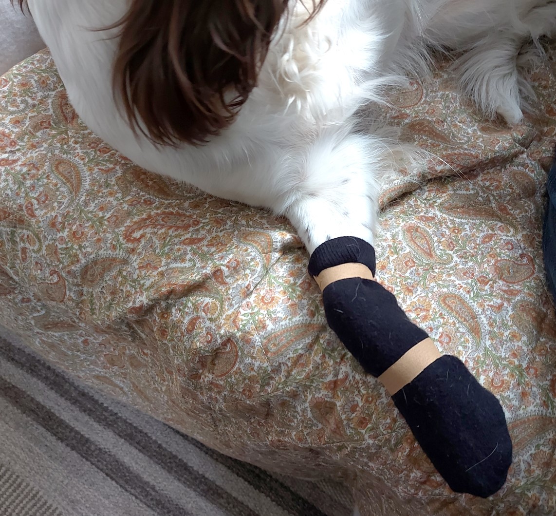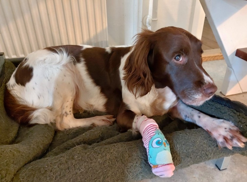 Den næste uge skal Maggie have renset sår, have sok på og plasticpose på foden ude. Det var svært nok med Rosie, for det gik noget ud over værdigheden, og det kan en hund (heller ikke) lide.