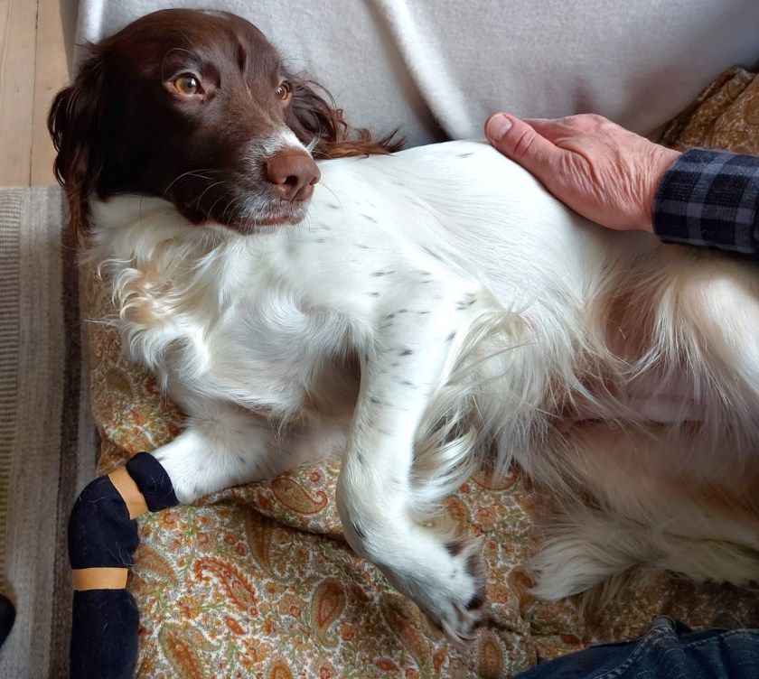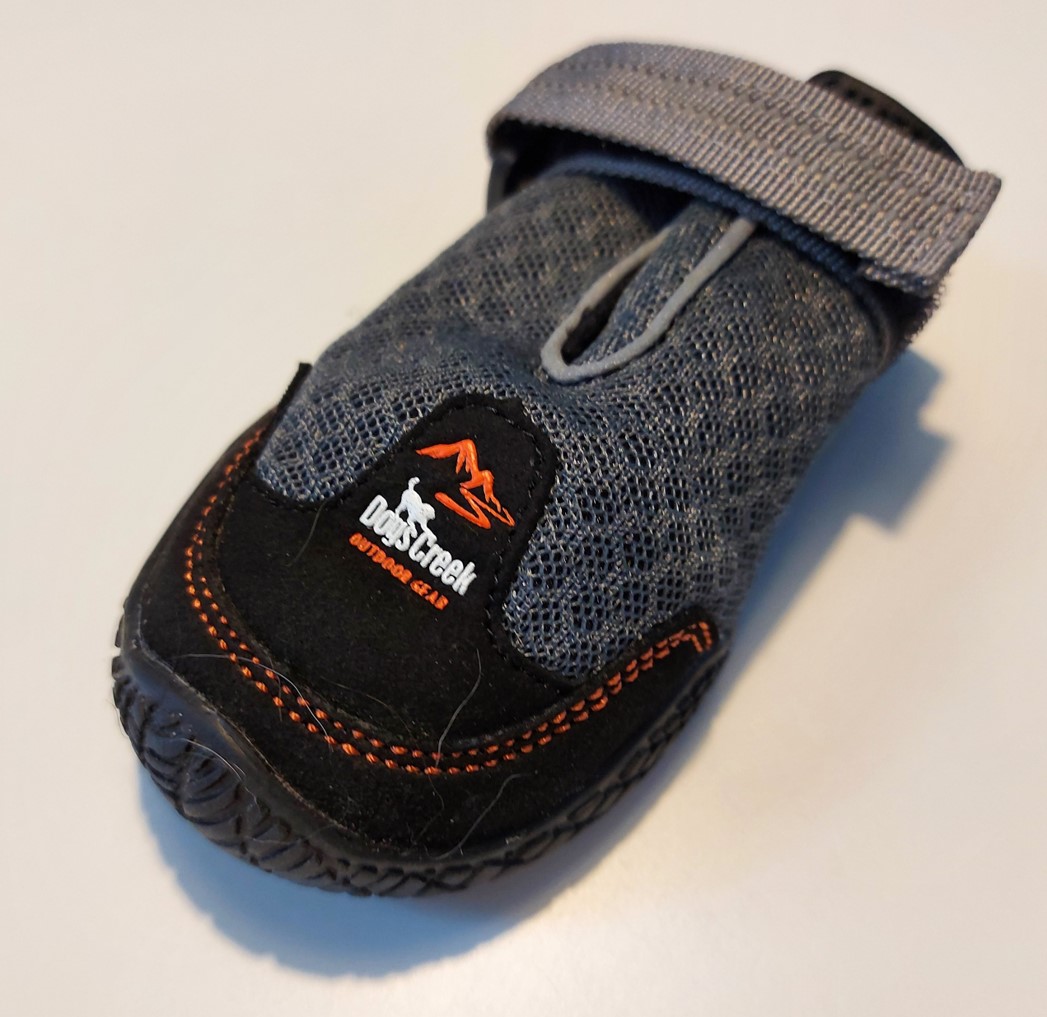 Maggie had an accident at her first training session of the year. A sharp stone in the frozen ground cut up her paw so badly that the vet had to stich her up. She had to wear a sock inside and a little trainer outside for 10 days to protect the healing wound. The little trainer looked so cute, I thought.