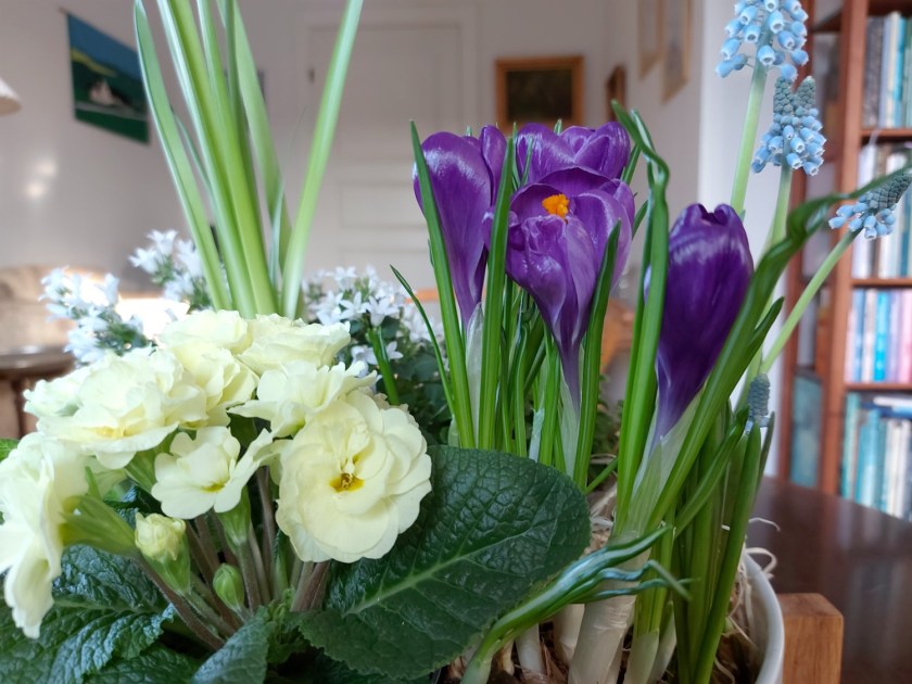 Every supermarket sells pots with spring bulbs and flowers. I just love buying them to brighten up our living room and kitchen. They don’t last long inside, but they can all be planted in the garden later.