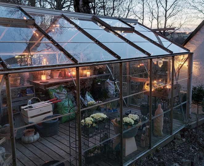 Der er godt nok et tyndt lag frost på indersiden af glasset om morgenen, men lysene holder luften i rummet i bevægelse, så frosten ikke sætter sig, og planterne overlever. Ja – planterne ville nok overleve under alle omstændigheder. Men blomstringen ville være ødelagt, og det ville da være trist.