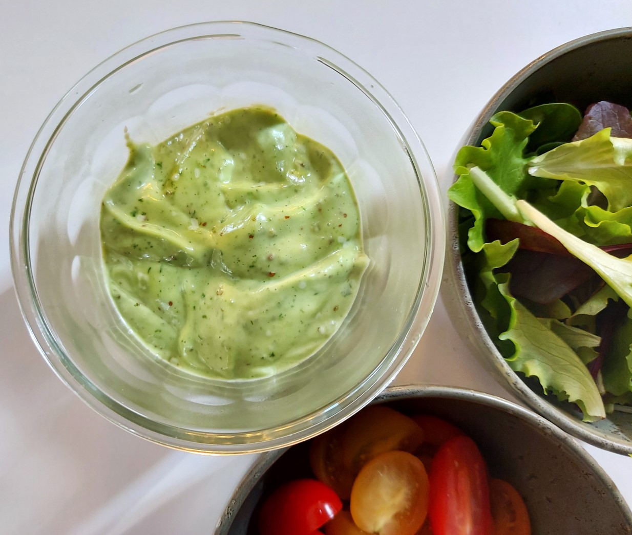 Server med skinke, babysalat, cherrytomater og en klat af den forårsgrønne mayo. Hvis du er lidt klogere end mig, husker du at gemme lidt basilikumblade til pynt. Det bliver så dekorativt, og det smager af forår.