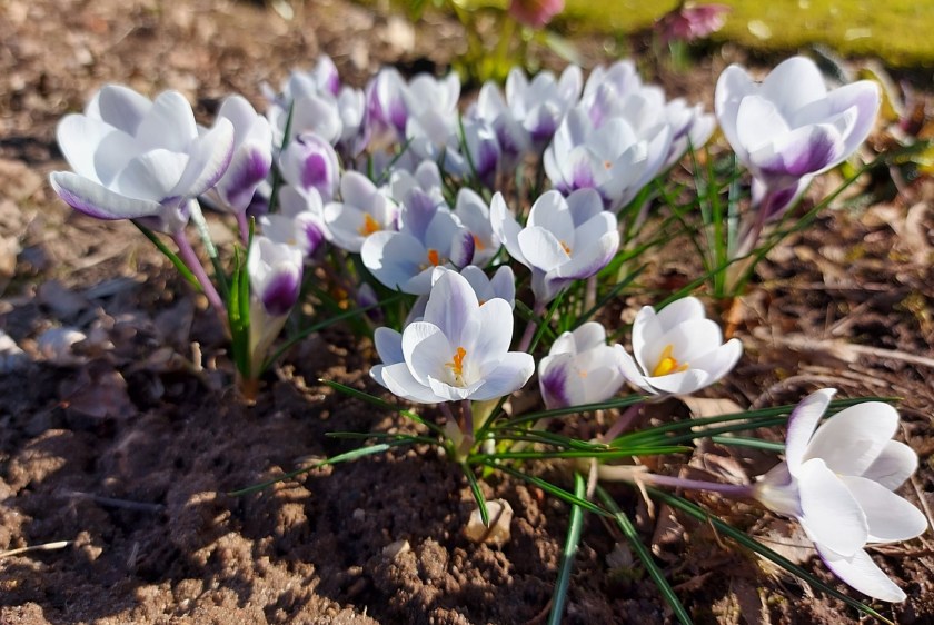 De stribede krokus her blev egentlig købt som en lille pose med hvide krokus. De har en lilla stribe på kronbladenes yderside, men det gør nu ikke spor. Det er kønne alligevel.