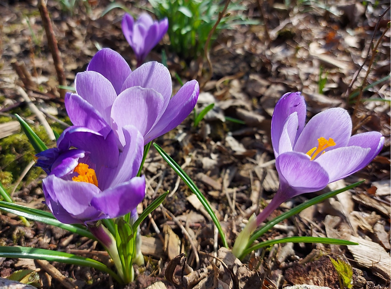 Der kommer krokus op alle vegne i haven lige nu. Når solen falder på sådan en lille flok krokus ude i haven, er det er en fest for øjnene. En forårsfest for os og for bierne, der samler årets første pollen fra piletæernes gæslinger og fra de farvestrålende krokus.