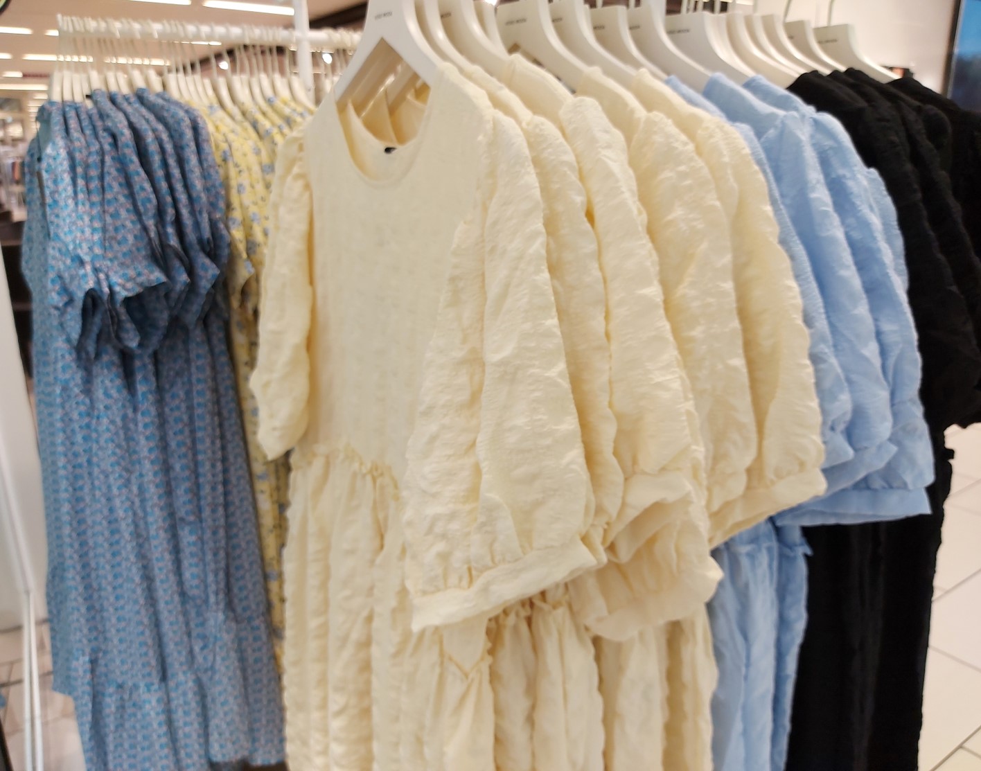 Men øv – det var lidt forstemmende. For der var ikke rigtig noget voksentøj. Stativ efter stativ med flæsekjoler, pufærmer, pastelfarver… Bedårende til en treårig, men ikke til voksne.