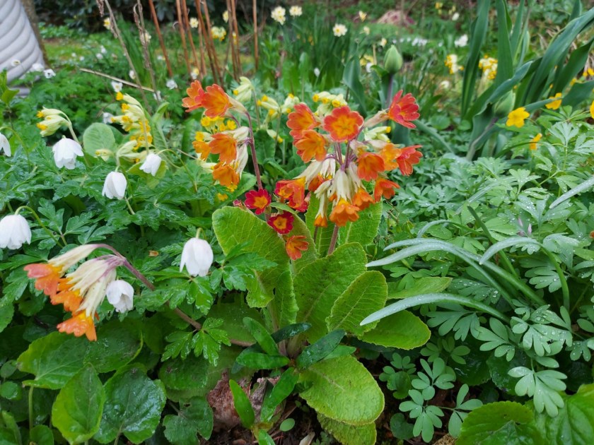 De vilde primula ligner meget nogle af dem, jeg har i haven. De er da også samme slags, men mine er dyrkede, så de er kun halvvilde. Det er en af de halvvilde, der har krydset sig med en anden primula og lavet den her bolchefarvede: