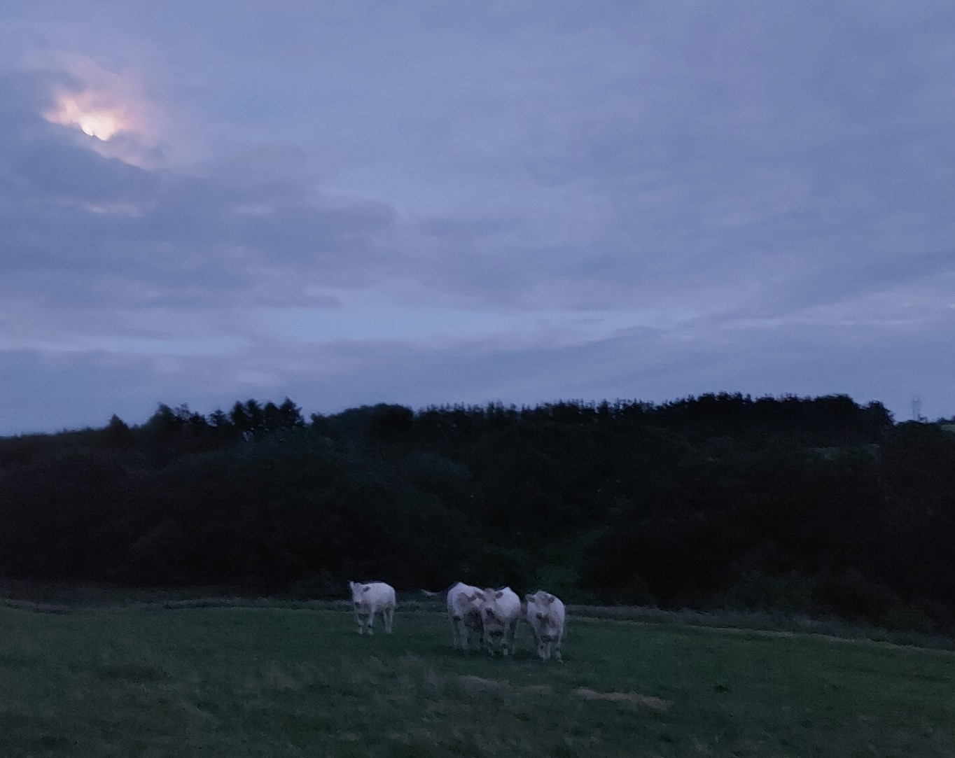 Køerne lyste hvidt på marken, og månen sendte lidt svage stråler ud fra bag skyerne. Og der var så stille, så stille. Vi kunne høre bækken klukke nede i engen og hundenes snusen i græsset.