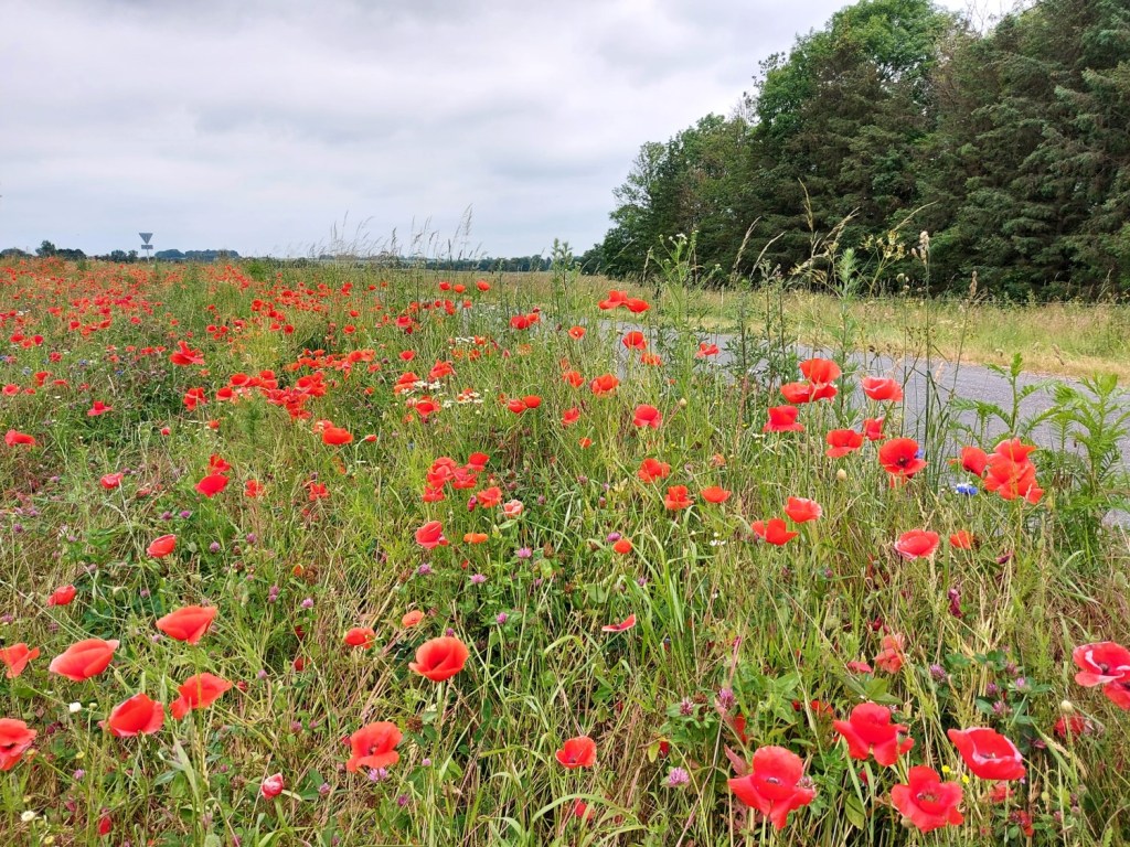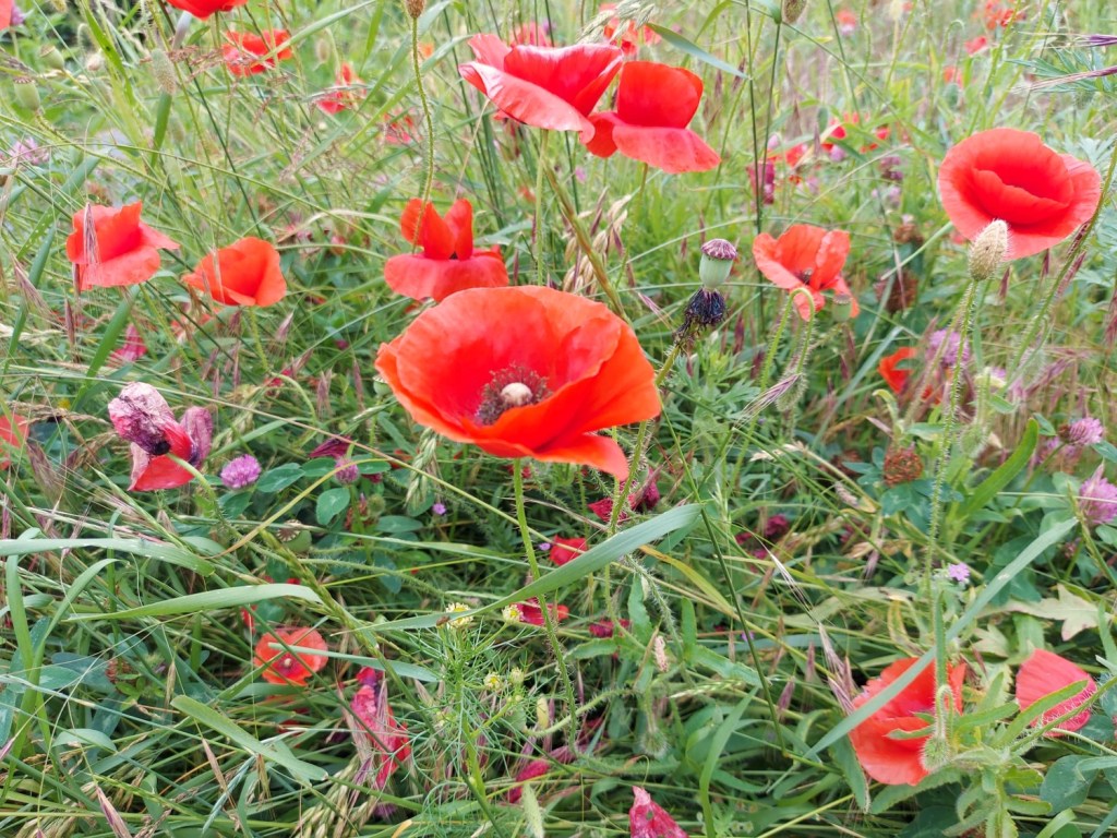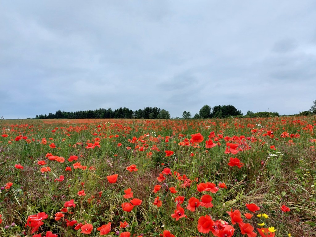 Denne gang var det ikke en rapsmark, der var invaderet, men en mark, der tilsyneladende lå brak. Og sikke et syn. Valmuer så langt øjet rakte. Det var overskyet, men det gjorde næsten kun farverne mere intense.