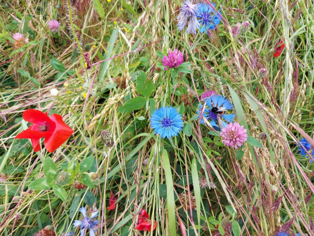 Jeg gik lidt ind i marken – der var spor efter, at andre havde gjort det samme, og jeg holdt mig i deres fodspor. Og mens jeg kiggede ned for ikke at træde på de smukke blomster, så jeg, at under valmuerne blomstrede både kornblomster og rødkløver. Som at være i blomsterparadis…