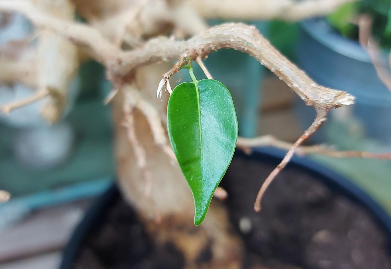 Det var først, da rengøringspersonalet kom tilbage i foråret før os andre, og vores vidunderlige, dygtige og optimistiske Anne-Grethe fik øje på planten, at den fik lidt at leve af igen. Og en dag brød et nyt blad frem fra de tørre grene.