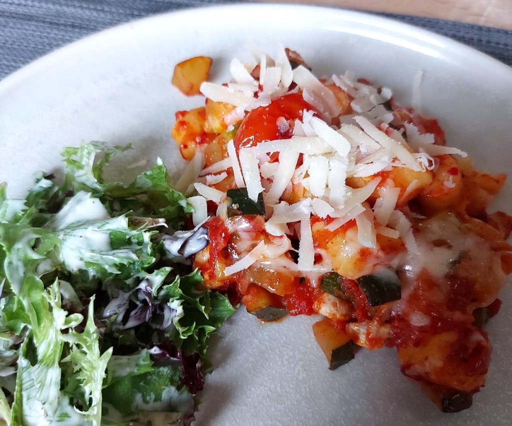 Læg gnocchi i bunden af et ovnfast fad og bland dem med grøntsags/Nduja blandingen. Drys med lidt revet parmesan/grana og sæt det i ovnen på 200 grader. Når osten er smeltet og sovsen bobler, er retten færdig. Server med salat og et ekstra drys parmesan.