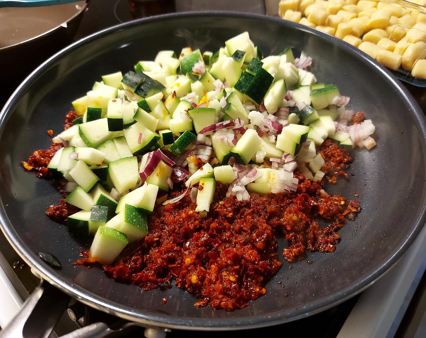 Nduja indeholder meget fedt og smelter hurtigt, så den kan faktisk bruges til at stege i. I går brugte jeg noget af den i en hurtig og nem ret med squash, tomater og gnocchi.