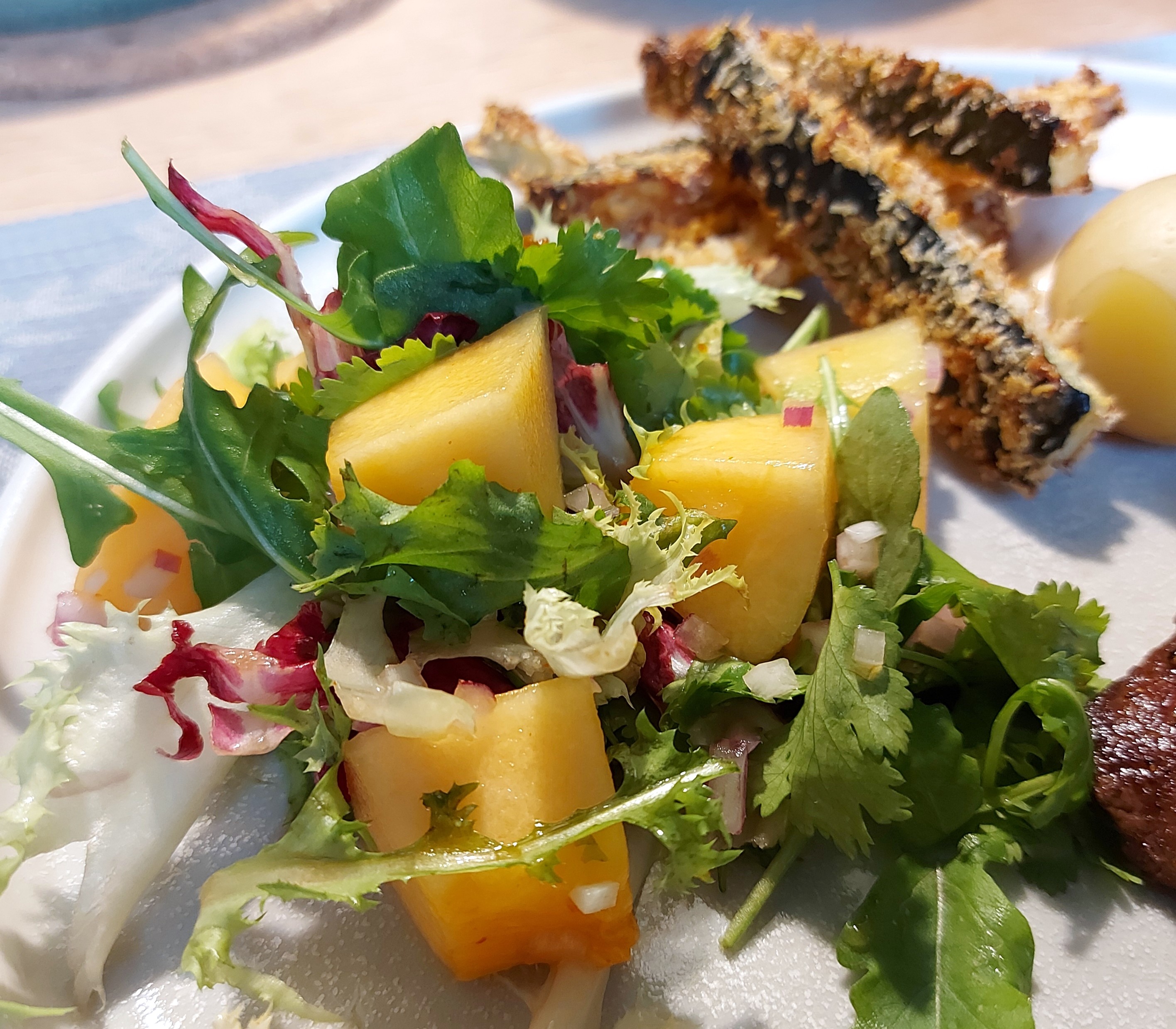 Når dippen er så stærk, som den er, er det slet ikke dårligt med en frisk salat med frugt i til – her har jeg blandet de sædvanlige marinerede melonstykker med blandede salatblade.