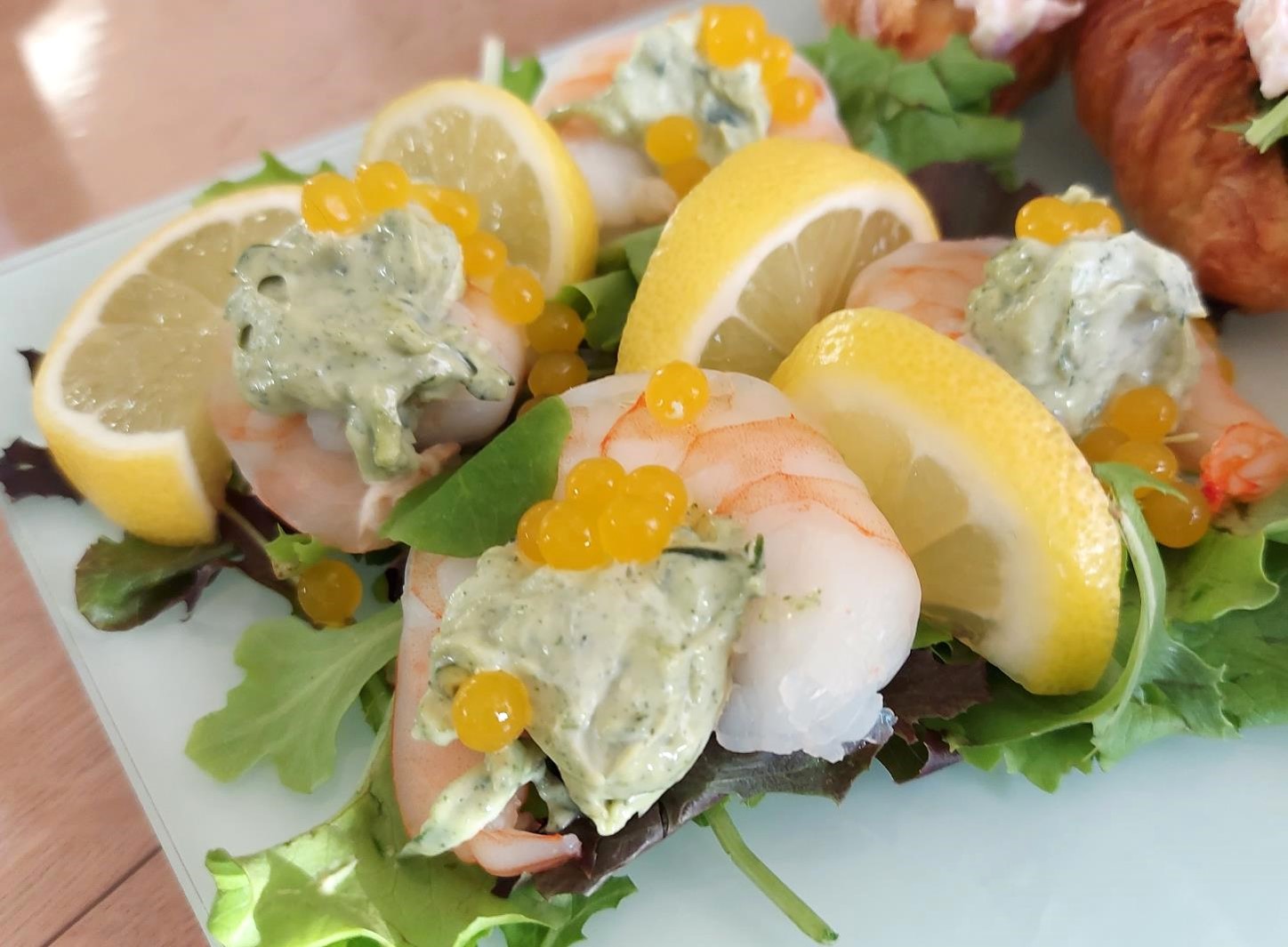 De tre forskellige småretter var en god blanding af købt og hjemmelavet. Der var store rejer, kogt 2 minutter i letsaltet vand med lidt citronsaft, kølet ned og pyntet med hjemmelavet estragonmayo, citronskiver og citronperler.