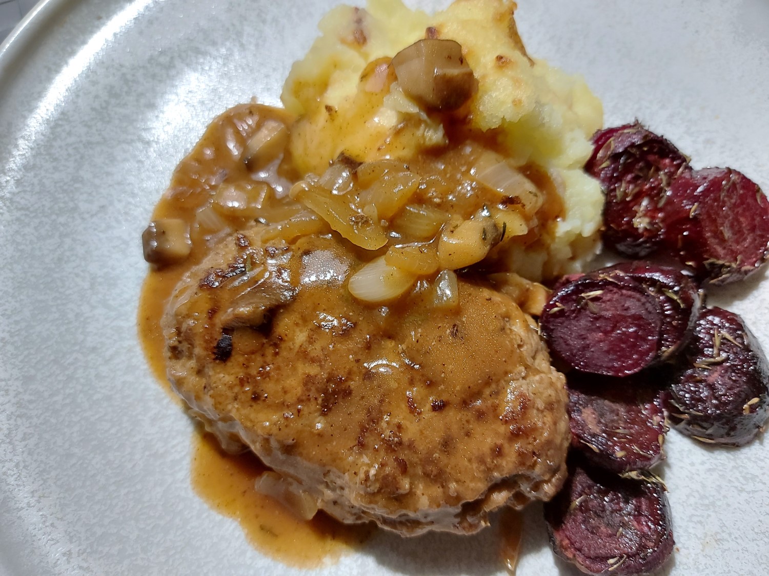 Bøf med løg er altid populært, men har du prøvet at lave Salisbury Steak en gang imellem i stedet for? Let krydret kød i en virkelig god løgsovs med champignon. Det er en rigtig efterårs- og vinterret, der næsten kræver kartoffelmos.