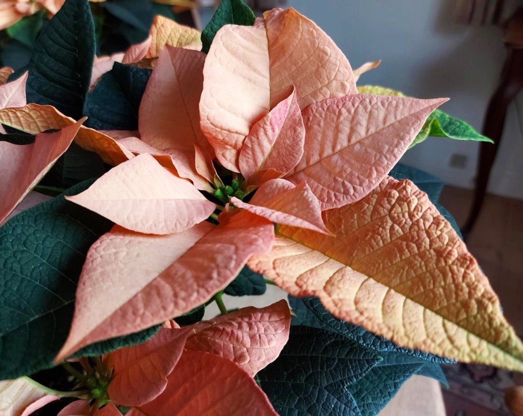 Jeg har lige købt en ‘stjerneblomst’ / ‘vinterstjerne’ i gylden laksefarvet – aner ikke, hvad den hedder, men den er smuk i en lille glasskål med guldkant.