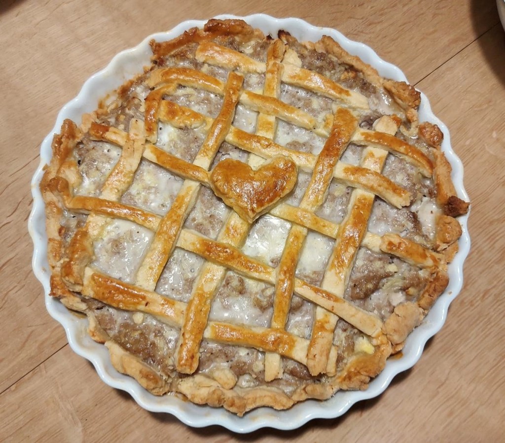 Rul 2/3 af dejen tyndt ud og læg den i et velsmurt tærtefad. Fordel fyldet over tærten. Rul så den sidste tredjedel af dejen ud og skær den i tynde strimler. Lav fletværk af strimlerne ovenpå fyldet. Jeg havde lige en lille klat dej til overs, som jeg formede til et hjerte.