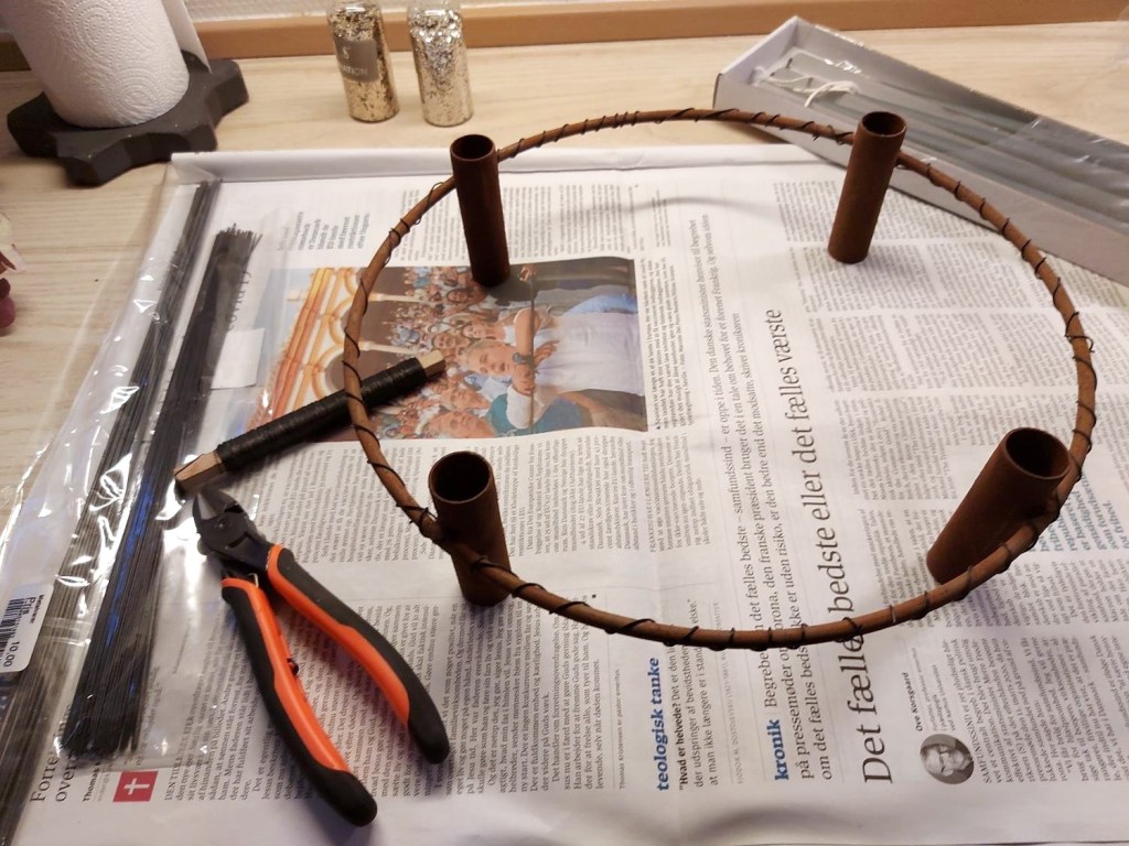 Allerførst tog jeg kransen og viklede en mellemfin elefanttråd omkring ringen. Tråden virker som stopklods, og holder pynten på plads, så den ikke glider på ringen.