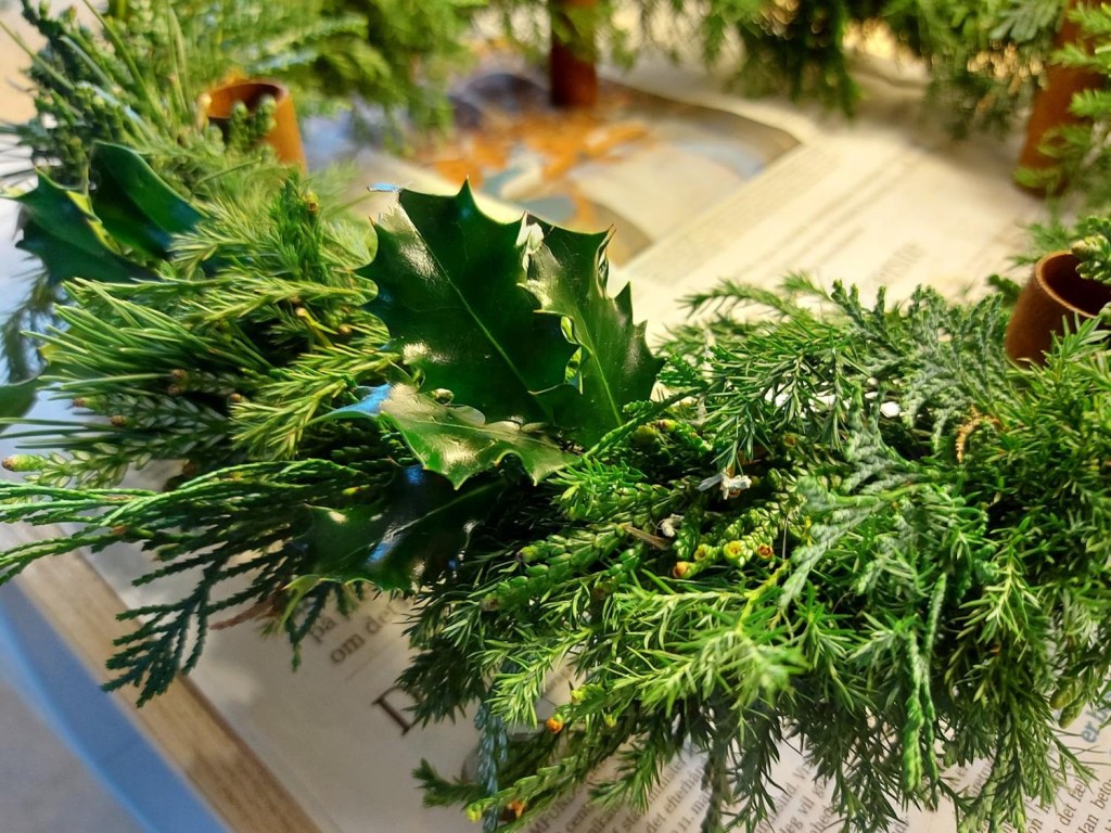 Jeg startede med en tur rundt i haven sammen med Rosie, hvor ‘vi’ plukkede forskelligt stedsegrønt ind. Thuja, fyr, og kristtorn. Jeg havde købt et bundt blød ene, for den lethed, som den bløde ene giver, er der ikke rigtigt andet, der kan levere.