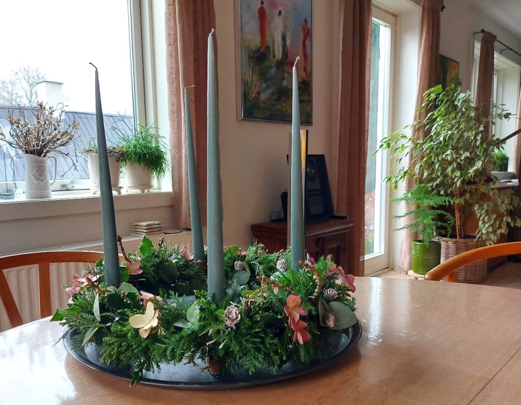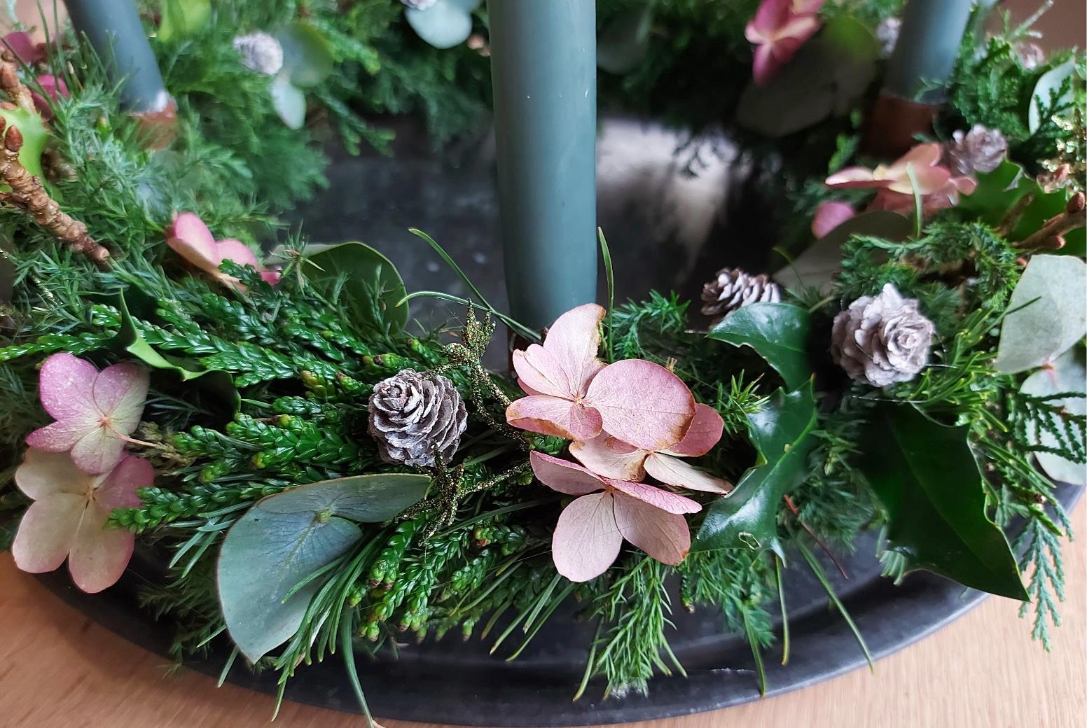 Det tager et par timer at lave sådan en krans, men det er et par hyggelige timer, hvor man kan stå og fundere lidt over pynt og advent og verdens gang – og lytte til lidt god musik, mens man arbejder.
