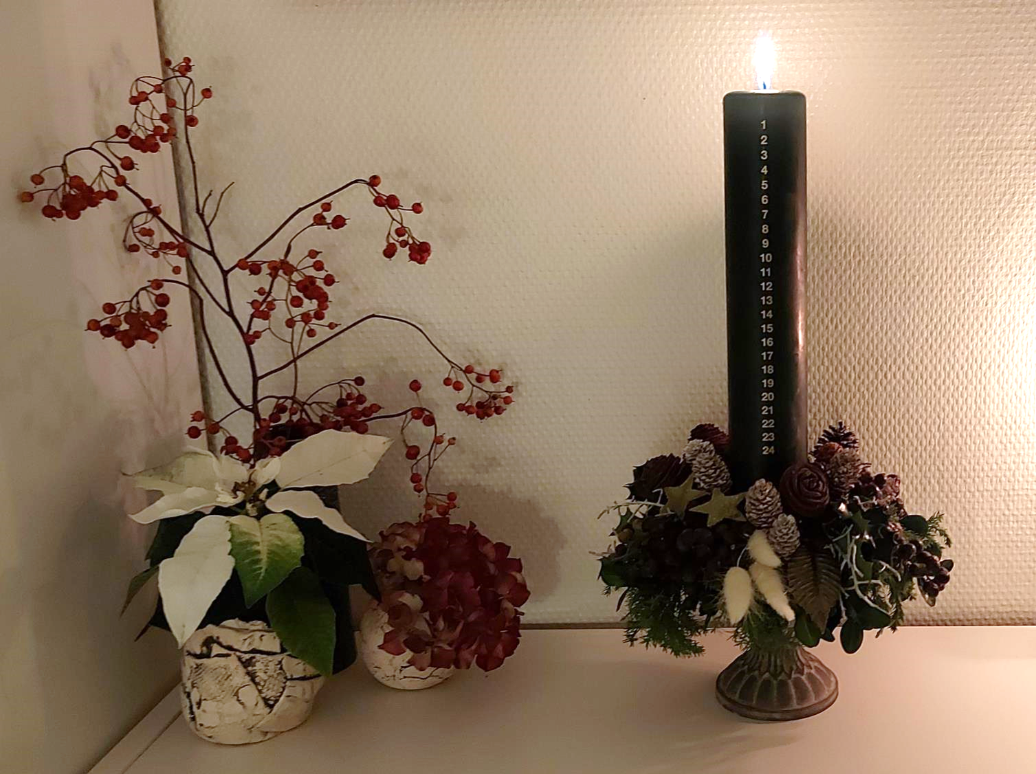 Kalenderlys fatter jeg dog – og dørkranse. Dørkransen kommer der lidt om i morgen.