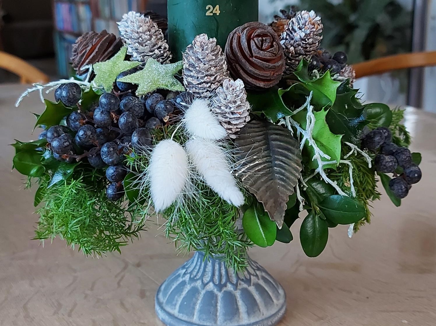 Årets kalenderlys minder meget om det fra sidste år. Jeg synes, det er så fint med en lille, buttet dekoration i den lille opsats, så jeg lavede sådan en igen i år. Hvordan den er bygget op, kan du se i indlægget fra sidste år. De hvide harehalegræs mindede mig om minkhaler. Så der er også en slags ‘in memoriam’ i dekorationen.
