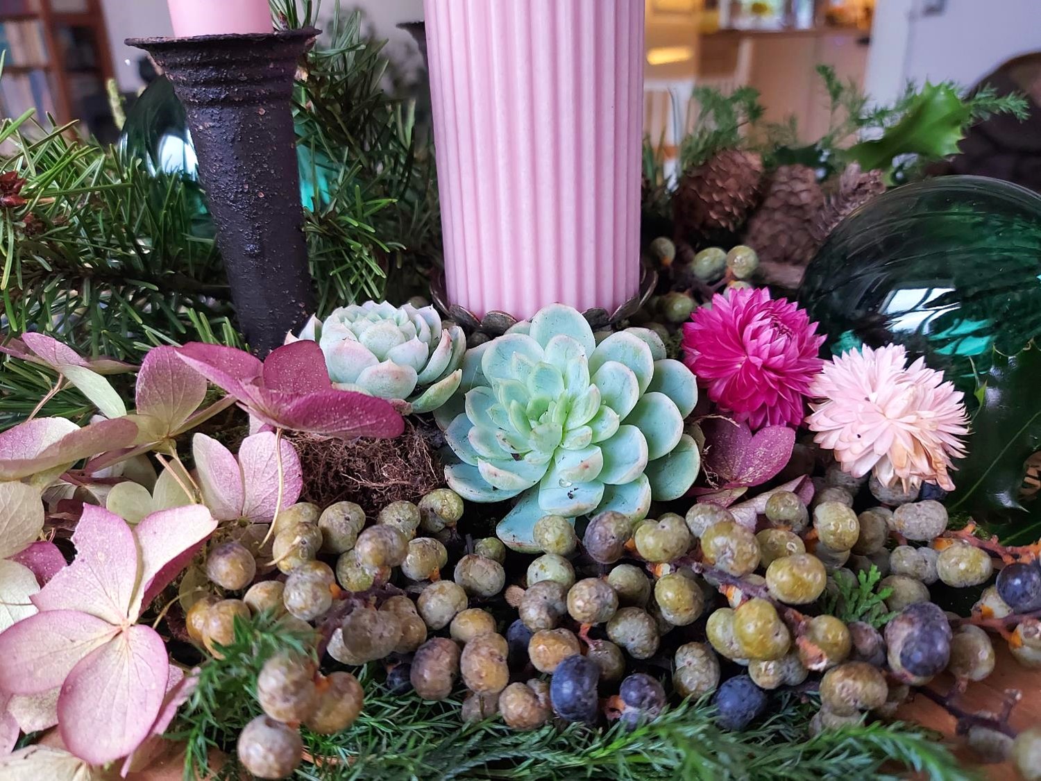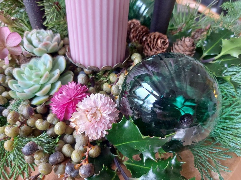 Gammelrosa lys, grønt fra haven, tørrede blomster, glaskuglerne og pynt.