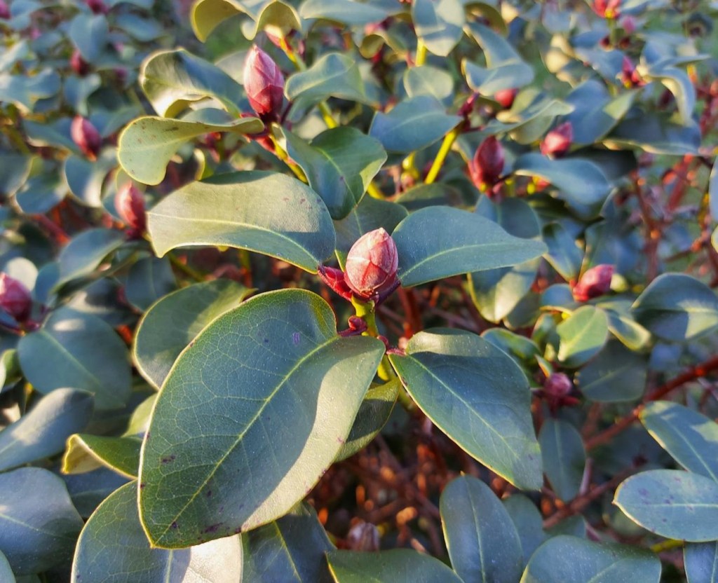 Og vi kan gå på jagt efter tegn på næste år. For her i den dybe vinter står rododendron klar med knopper. De venter bare. På nogle lux og nogle celsiusser…