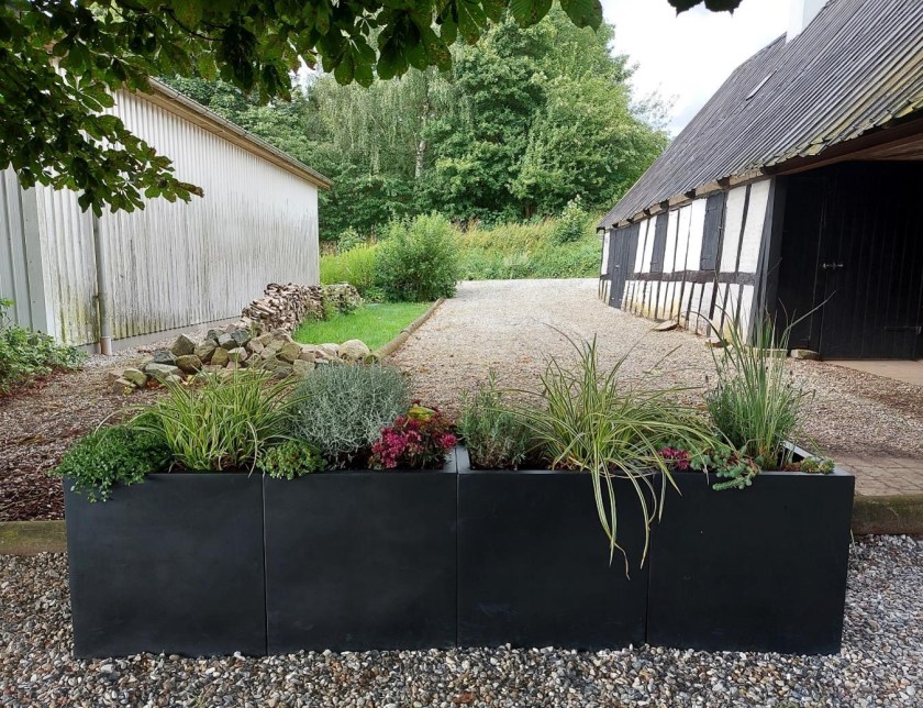 I august fik vi sat de store krukker på plads for enden af indkøslen og puttet planter i dem. Vi var i det hele taget meget i haven i august og i gang med lidt større projekter.